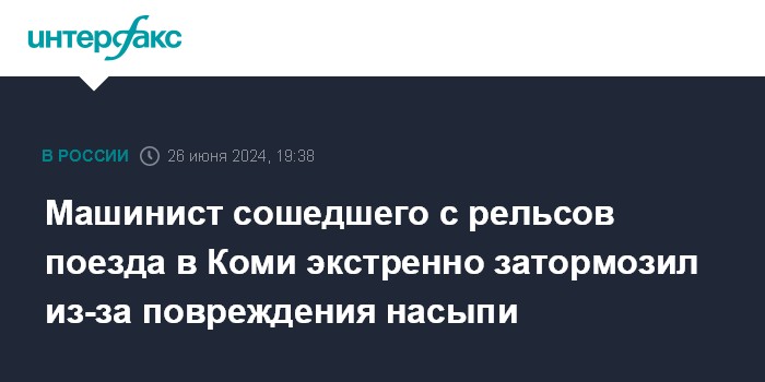 Машинист сошедшего с рельсов поезда в Коми экстренно затормозил из-за повреждения насыпи