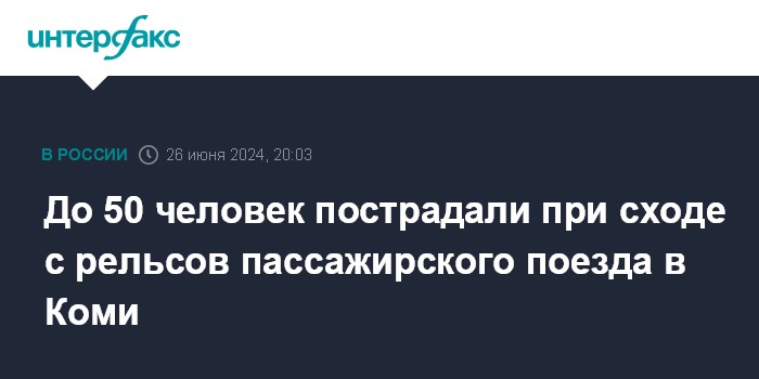 Москва. 26 июня. INTERFAX.RU - Почти полсотни человек получили травмы при сходе с рельсов пассажирского поезда в Коми. Об этом сообщили в среду "Интерфаксу" в экстренных службах.