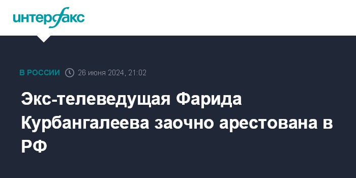 Москва. 26 июня. INTERFAX.RU - Замоскворецкий суд Москвы по ходатайству следствия заочно арестовал бывшую телеведущую Фариду Курбангалееву, обвиняемую в оправдании терроризма и распространении ложной информации о деятельности Вооруженных сил РФ, сообщили "Интерфаксу" в пресс-службе суда.