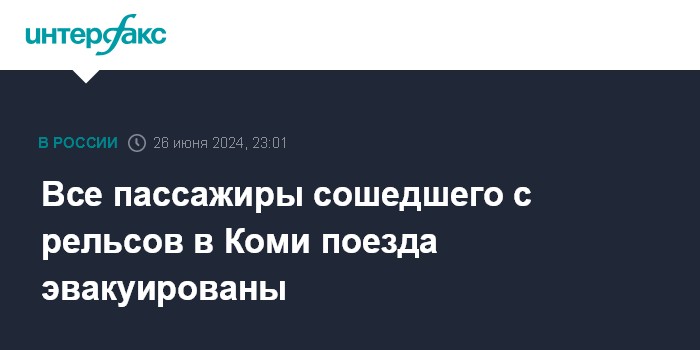 Москва. 26 июня. INTERFAX.RU - Все пассажиры поезда, вагоны которого сошли с рельсов в Коми, эвакуированы в Инту, сообщает пресс-служба регионального правительства.