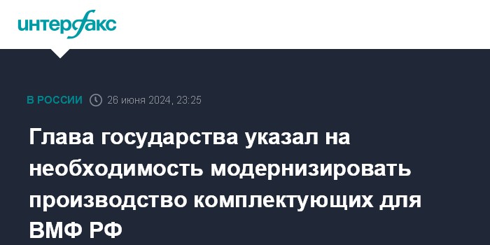 Москва. 26 июня. INTERFAX.RU - Многие производители комплектующих для ВМФ России загружены на полную, нужно форсированно модернизировать предприятия, заявил президент РФ Владимир Путин.