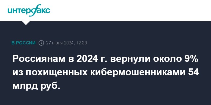 Россиянам в 2024 г. вернули около 9% из похищенных кибермошенниками 54 млрд руб.