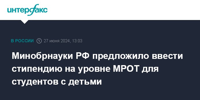 Москва. 27 июня. INTERFAX.RU - Минобрнауки РФ предлагает включить в новый нацпроект "Семья" ежемесячную социальную стипендию на уровне МРОТ для студентов с детьми дошкольного возраста, сообщил журналистам в пресс-службе Минобрнауки РФ в четверг.