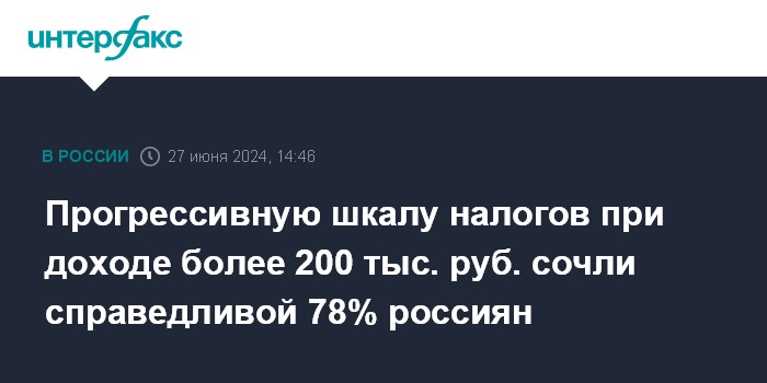 Москва. 27 июня. INTERFAX.RU - Более трех четвертей россиян (78%) считают справедливым введение прогрессивной шкалы налогообложения для физических лиц, чей ежемесячный доход превышает 200 тысяч рублей, свидетельствуют данные опроса ВЦИОМ, опубликованные в четверг на его сайте.