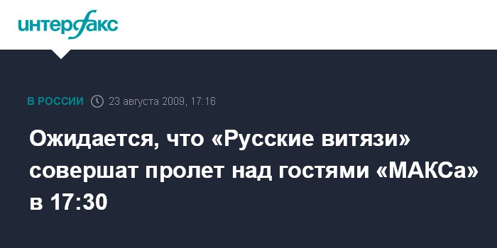 По словам организаторов авиасалона, "Русские витязи" сделают торжественный проход перед посетителями "МАКС-2009" примерно в 17:30 мск.