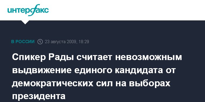Новоград-Волынский. 23 августа. INTERFAX.RU - Председатель Верховной Рады Украины Владимир Литвин считает нереальным выдвижение единого кандидата от демократических сил на предстоящих президентских выборах.