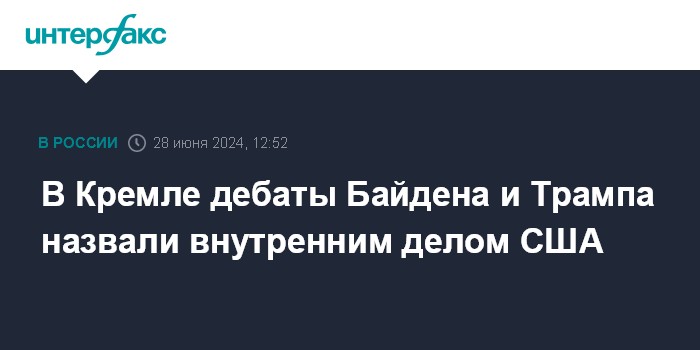 Москва. 28 июня. INTERFAX.RU - В Кремле заявили, что считают внутренним делом США дебаты претендентов на пост президента Джо Байдена и Дональда Трампа, но отслеживают те заявления, которые были сделаны.
