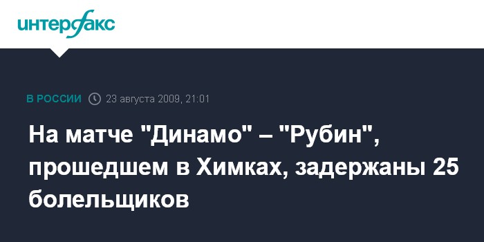 Москва. 23 августа. ИНТЕРФАКС-ЦЕНТР - В подмосковном городе Химки в ходе футбольного матча между командами "Динамо" (Москва) и "Рубин" (Казань) сотрудники правоохранительных органов задержали 25 болельщиков, сообщили в воскресенье "Интерфаксу" в пресс-службе ГУВД по Московской области.
