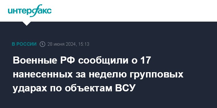 "С 22 по 28 июня Вооруженными силами Российской Федерации нанесено 17 групповых ударов высокоточным оружием и ударными беспилотными летательными аппаратами, в результате которых поражены: обеспечивавшие работу предприятий ВПК Украины объекты энергетики, инфраструктура военных аэродромов, логистические центры накопления вооружения, переданного ВСУ западными странами, а также цеха сборки и места хранения ударных беспилотных летательных аппаратов и безэкипажных катеров", - сказали в Минобороны РФ.