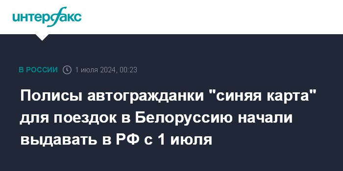Москва. 1 июля. INTERFAX.RU - Полисы "автогражданки" "синяя карта" для поездок в Белоруссию начали выдаваться в РФ с 1 июля 2024 года, согласно решению бюро "Зеленая карта" Российского союза автостраховщиков (РСА), сообщили в союзе.