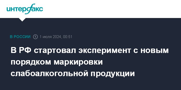 Москва. 1 июля. INTERFAX.RU - Эксперимент по применению нового порядка маркировки слабоалкогольной продукции (крепостью не более 9%) стартует в РФ с 1 июля 2024 года и завершится, как ожидается, 31 августа 2025 года. Соответствующее постановление ранее было утверждено правительством РФ.
