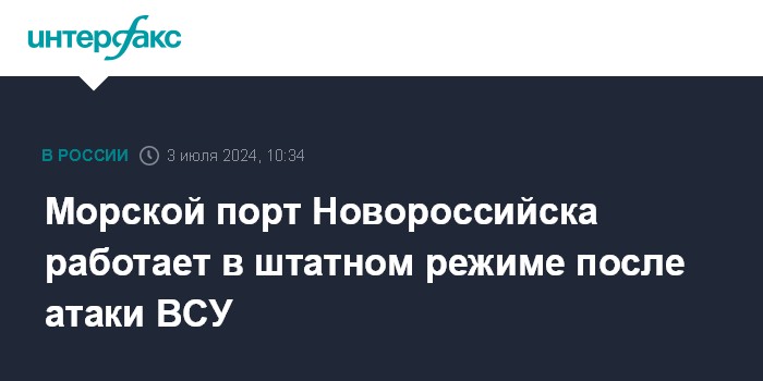 Москва. 3 июля. INTERFAX.RU - Морской порт Новороссийска после атаки безэкипажных катеров ВСУ минувшей ночью работает в штатном режиме, сообщили "Интерфаксу" в администрации города.