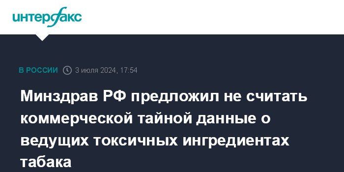 Москва. 3 июля. INTERFAX.RU - Минздрав России предложил отнести к информации, которая не может составлять коммерческую тайну, данные о наличии и количестве в составе табачных изделий ингредиентов, которые приводят к усилению никотиновой зависимости и оказывают токсическое воздействие.