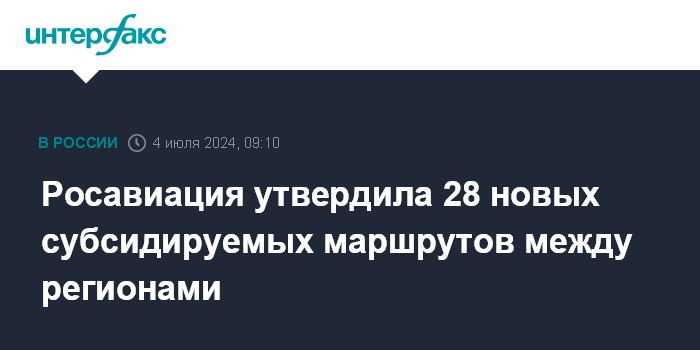 Москва. 4 июля. INTERFAX.RU - Росавиация утвердила 28 новых субсидируемых маршрутов между российскими регионами, сообщил журналистам представитель ведомства.