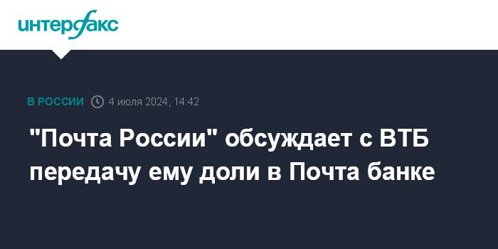 Ранее 4 июля первый зампред ВТБ Дмитрий Пьянов сказал "Интерфаксу", что кредитная организация обсуждает вопрос интеграции Почта банка в свою структуру на горизонте 2026 года. Он объяснял, что Почта банк "в силу разных причин" имеет неполную линейку продуктов, не имеет достаточного ИТ-бюджета, а это критично для развития растущего розничного бизнеса.