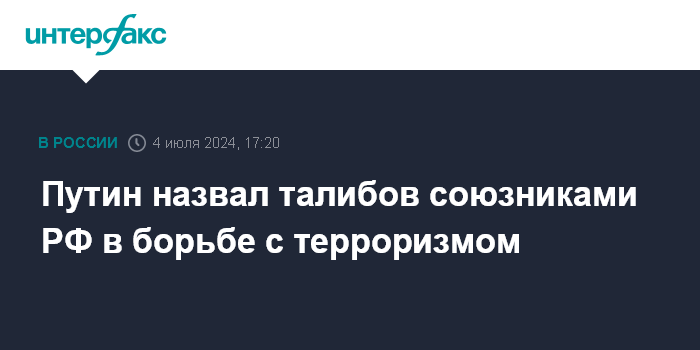 Москва. 4 июля. INTERFAX.RU - Движение "Талибан" (запрещенное в России как террористическая организация) контролирует власть в Афганистане и потому заинтересовано в стабильности в этой стране, являясь нашими союзниками в борьбе с терроризмом, заявил президент РФ Владимир Путин.