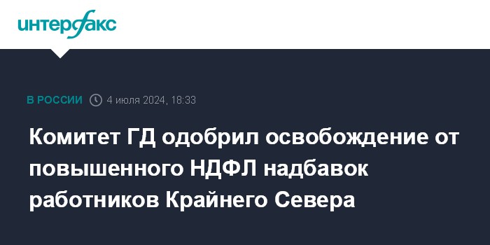 Москва. 4 июля. INTERFAX.RU - Комитет Госдумы по бюджету и налогам на заседании в четверг одобрил поправку, которая освобождает от повышенного НДФЛ надбавки к зарплате для работников районов Крайнего Севера и приравненных к ним местностей с неблагоприятными условиями.