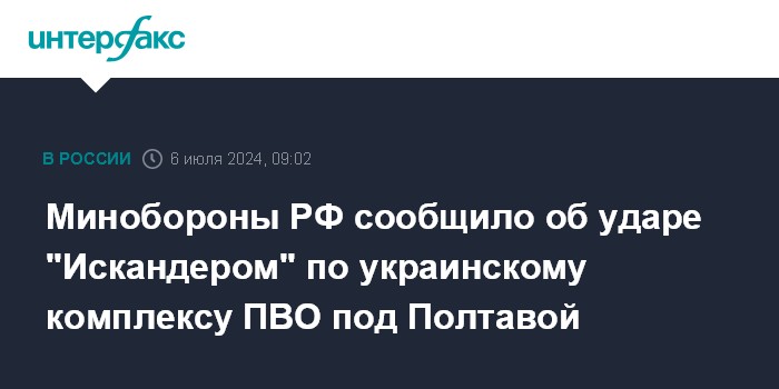 Москва. 6 июля. INTERFAX.RU - Российские военные нанесли удар оперативно-тактическим комплексом "Искандер-М" по украинскому комплексу противовоздушной обороны (ПВО) С-300 в Полтавской области.