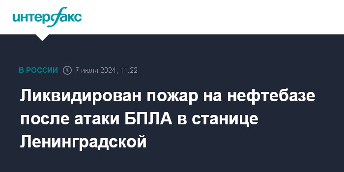 Москва. 7 июля. INTERFAX.RU - Спасатели потушили пожар на нефтебазе после атаки БПЛА в ночь с 5 на 6 июля в станице Ленинградской Краснодарского края, сообщает оперштаб Кубани в воскресенье.