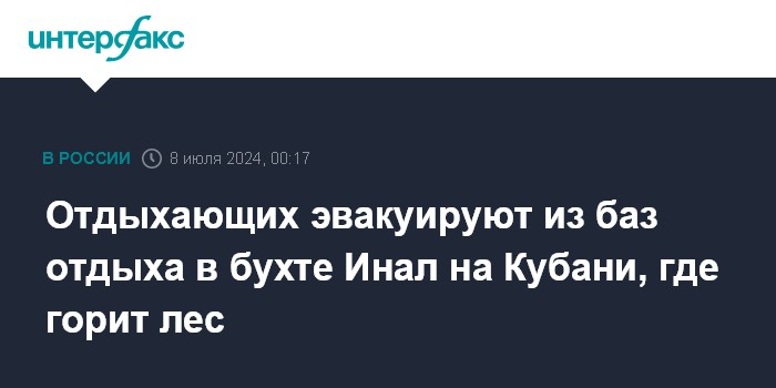 Москва. 8 июля. INTERFAX.RU - Отдыхающих эвакуируют из баз отдыха в бухте Инал Туапсинского района (Краснодарский край), где спасатели тушат лесной пожар на площади 6 тыс. кв. метров, сообщил глава района Сергей Бойко в своем телеграм-канале.
