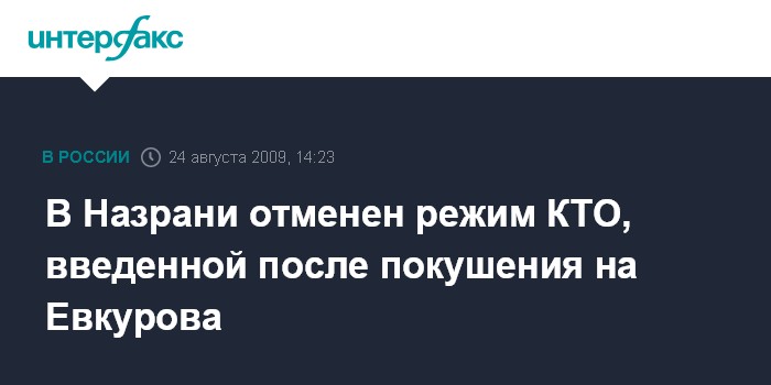 Назрань. 24 августа. INTERFAX.RU - Режим контртеррористической операции, который был введен 22 июня этого года после покушения на президента Ингушетии Юнус-Бека Евкурова, отменен решением оперативного штаба республики.