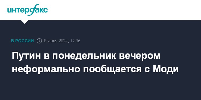Москва. 8 июля. INTERFAX.RU - Президент Владимир Путин в понедельник вечером неформально пообщается с премьер-министром Индии Нарендрой Моди, который 8-9 июля посетит Россию с официальным визитом, заявил на брифинге пресс-секретарь главы российского государства Дмитрий Песков.