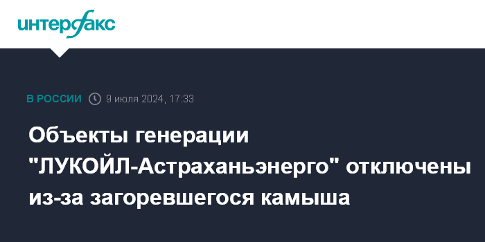 Москва. 9 июля. INTERFAX.RU - В Астрахани из-за загоревшегося камыша отключили объекты генерации Астраханской ТЭЦ-2 и ПГУ-235 (находятся в ведении ООО "ЛУКОЙЛ-Астраханьэнерго"), сообщил в Telegram вице-губернатор - председатель правительства Астраханской области Денис Афанасьев.