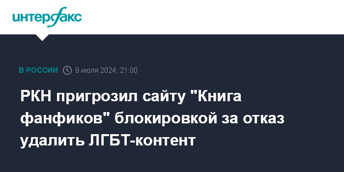 Москва. 9 июля. INTERFAX.RU - Роскомнадзор (РКН) направил владельцам сайта "Книга фанфиков" требование удалить с сайта запрещённую в РФ информацию с пропагандой ЛГБТ (в России движение ЛГБТ признано экстремистским и запрещено).