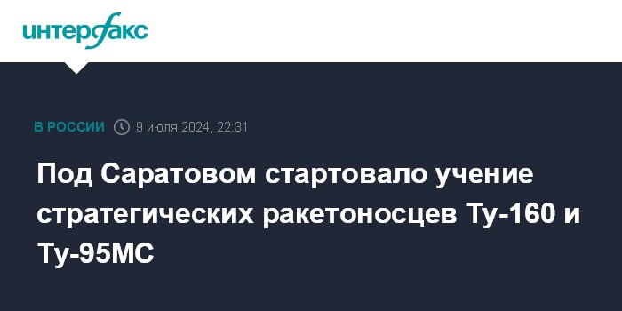Москва. 9 июля. INTERFAX.RU - Стратегические ракетоносцы-бомбардировщики Ту-95МС и Ту-160 отработают в небе над Саратовской областью воздушное патрулирование и пуски авиасредств по целям на полигонах, сообщает Минобороны России.
