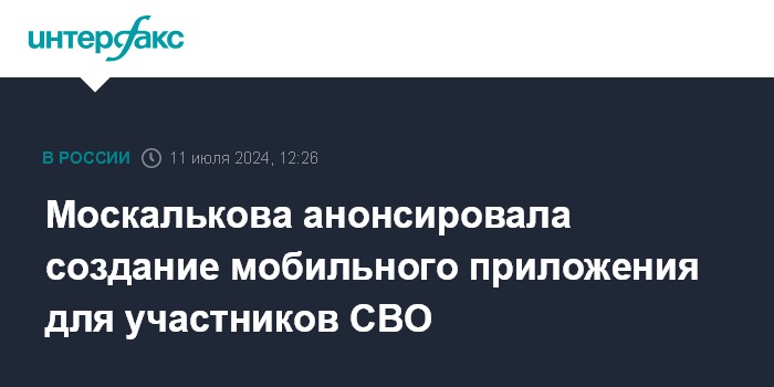 Москва. 11 июля. INTERFAX.RU - Уполномоченный по правам человека в России Татьяна Москалькова сообщила о создании мобильного приложения для участников СВО и их семей для получения юридической консультации.