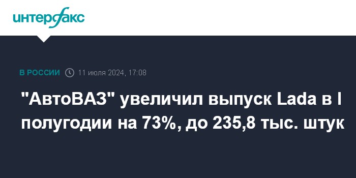 Москва. 11 июля. INTERFAX.RU - Производство автомобилей модельного ряда Lada в I полугодии 2024 года выросло на 73%, до 235,8 тыс. единиц, что превысило показатель за весь 2022 год, сообщил журналистам представитель "АвтоВАЗа" Сергей Ильинский.