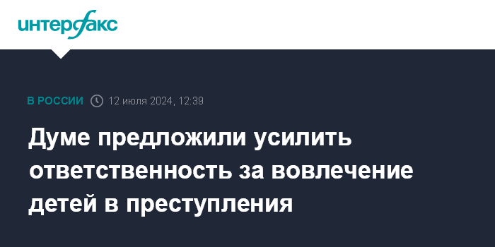 Москва. 12 июля. INTERFAX.RU - В Госдуму внесен проект закона об усилении ответственности за вовлечение несовершеннолетних в совершение преступлений и антиобщественных действий, сообщил председатель комитета нижней палаты по безопасности Василий Пискарев.