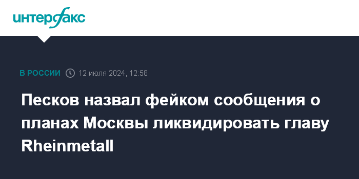 Москва. 12 июля. INTERFAX.RU - Сообщения СМИ о планах российской стороны ликвидировать гендиректора компании Rheinmetall, поставляющей оружие Украине, поданы в стиле фейков, серьезно к ним относиться невозможно, заявил пресс-секретарь президента РФ Дмитрий Песков.