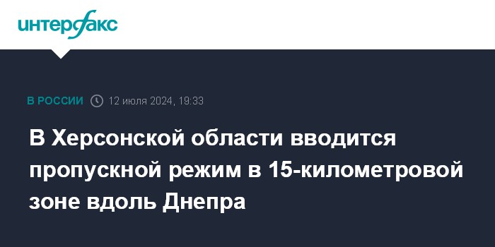 Москва. 12 июля. INTERFAX.RU - Пропускной режим вводится в 15-километровой зоне вдоль реки Днепр в Херсонской области в целях безопасности, сообщил губернатор региона Владимир Сальдо.