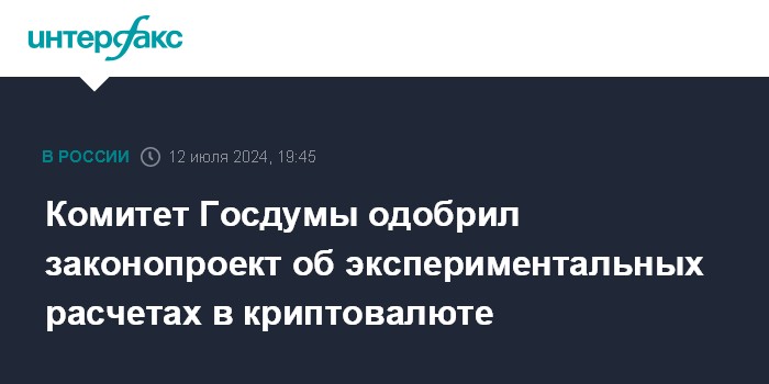 Москва. 12 июля. INTERFAX.RU - Комитет Госдумы по финансовому рынку одобрил к принятию в первом чтении законопроект, который позволяет ЦБ с 1 сентября запустить эксперимент по созданию площадки для использования криптовалют в международных расчетах.