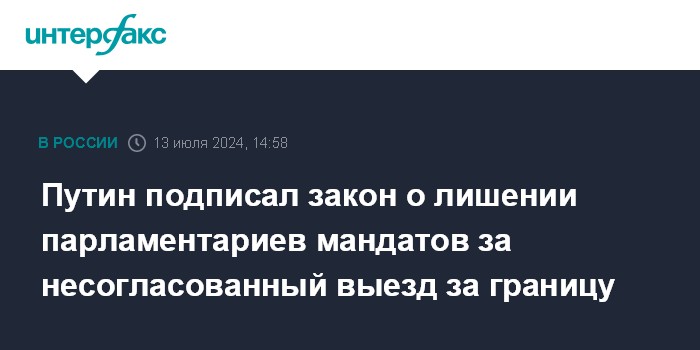 Москва. 13 июля. INTERFAX.RU - Президент РФ Владимир Путин подписал принятый Госдумой и одобренный Советом Федерации закон, обязывающий депутатов и сенаторов согласовывать с руководством палат парламента свои выезды за границу, иначе их могут лишить мандата.