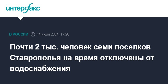 Москва. 14 июля. INTERFAX.RU - Временно ограничена подача воды в семь населенных пунктов Минераловодского округа Ставрополья, сообщается в телеграм-канале "Ставрополькрайводоканала" в воскресенье.