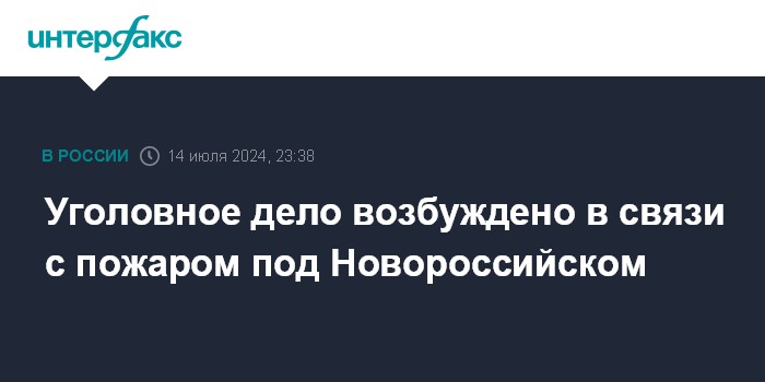 Москва. 14 июля. INTERFAX.RU - Уголовное дело возбуждено по факту пожара под Новороссийском, сообщила официальный представитель МВД РФ Ирина Волк в своем-телеграм-канале.