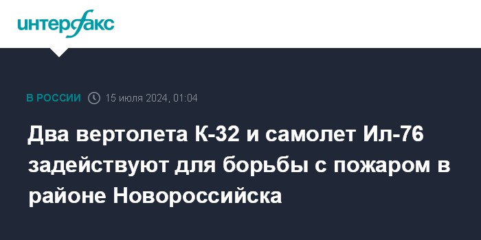 Москва. 15 июля. INTERFAX.RU - Два вертолета К-32 Минобороны РФ и самолет Ил-76 МЧС России прибудут утром для тушения пожара в районе Новороссийска, сообщает оперштаб Краснодарского края.