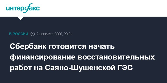 Ново-Огарево. 24 августа. ИНТЕРФАКС - Сбербанк в сентябре готов открыть финансирование восстановительных работ на Саяно-Шушенской ГЭС общим объемом до 20 млрд рублей, заявил глава банка Герман Греф на встрече с премьер-министром РФ Владимиром Путиным.