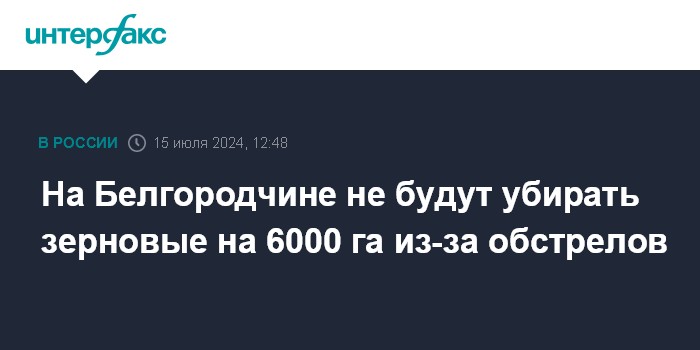 Москва. 15 июля. INTERFAX.RU - В приграничной зоне Белгородской области на площади 6 тысяч гектаров, или 8% общей площади, не будут убирать зерновые из-за обстрелов.
