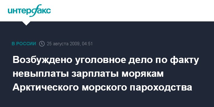 Владивосток. 25 августа. ИНТЕРФАКС - ДАЛЬНИЙ ВОСТОК - Уголовное дело возбуждено по факту невыплаты заработной платы работникам ОАО "Судоходная компания "Арктическое морское пароходство" (АМП), в том числе экипажам двух судов, задержанных за долги судовладельца в Китае.