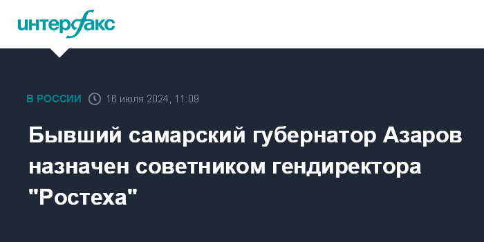 Москва. 16 июля. INTERFAX.RU - Бывший губернатор Самарской области Дмитрий Азаров заявил о своем назначении на должность советника генерального директора "Ростеха".