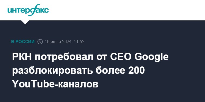 Москва. 16 июля. INTERFAX.RU - Роскомнадзор потребовал от гендиректора Google Сундара Пичаи восстановить на видеохостинге YouTube более 200 ранее заблокированных российских аккаунтов, сообщили "Интерфаксу" в пресс-службе РКН.