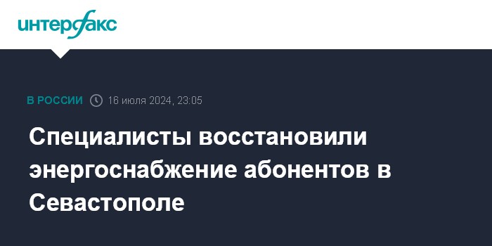 Москва. 16 июля. INTERFAX.RU - Электроснабжение абонентов восстановлено в Севастополе, сообщил врио замгубернатора города Евгений Горлов.