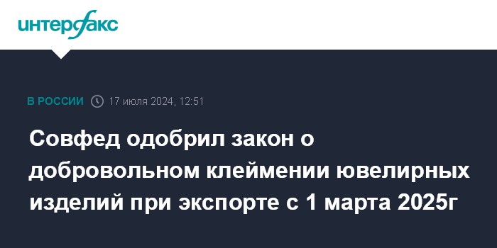 Москва. 17 июля. INTERFAX.RU - Совет Федерации на заседании в среду одобрил закон о добровольном порядке клеймения ювелирных изделий, предназначенных для продажи за пределами Евразийского экономического союза (ЕАЭС).