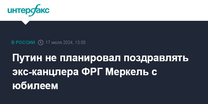 Москва. 17 июля. INTERFAX.RU - Президент РФ Владимир Путин не планирует поздравлять бывшего канцлера ФРГ Ангелу Меркель с юбилеем, они не общались уже несколько лет. Об этом заявил пресс-секретарь главы российского государства Дмитрий Песков.