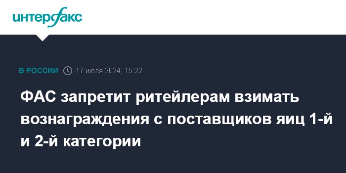 Москва. 17 июля. INTERFAX.RU - Федеральная антимонопольная служба (ФАС) России планирует запретить торговым сетям взимать вознаграждение с поставщиков куриных яиц первой и второй категории. Соответствующие изменения в 530-е постановление правительства, регулирующее правила установления предельно допустимых розничных цен на отдельные виды социально значимых продовольственных товаров, подготовлены ведомством и размещены на regulation.gov.ru.