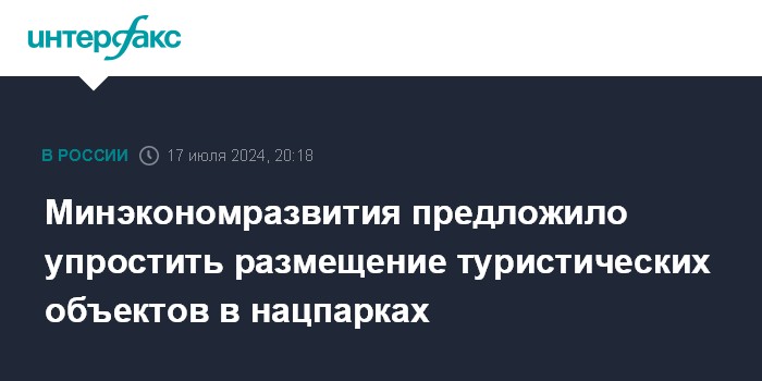 Москва. 17 июля. INTERFAX.RU - Минэкономразвития России предложило расширить перечень объектов, которые могут размещаться на территории нацпарков, а также отменить ряд ограничений для вовлечения объектов культурного наследия в туризм, сообщает пресс-служба министерства.
