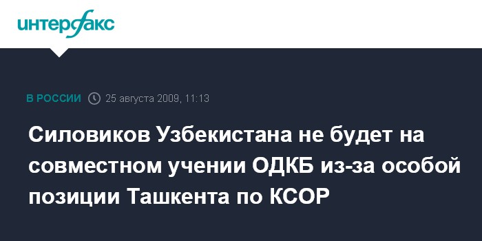 Москва. 24 августа. INTERFAX.RU - Представители силовых структур Узбекистана не будут принимать участия в совместном комплексном учении (СКУ) ОДКБ, которое начнется 26 августа и пройдет в три этапа на территории России, Белоруссии и Казахстана, сообщил "Интерфаксу-АВН" во вторник высокопоставленный военно-дипломатический источник в Москве.